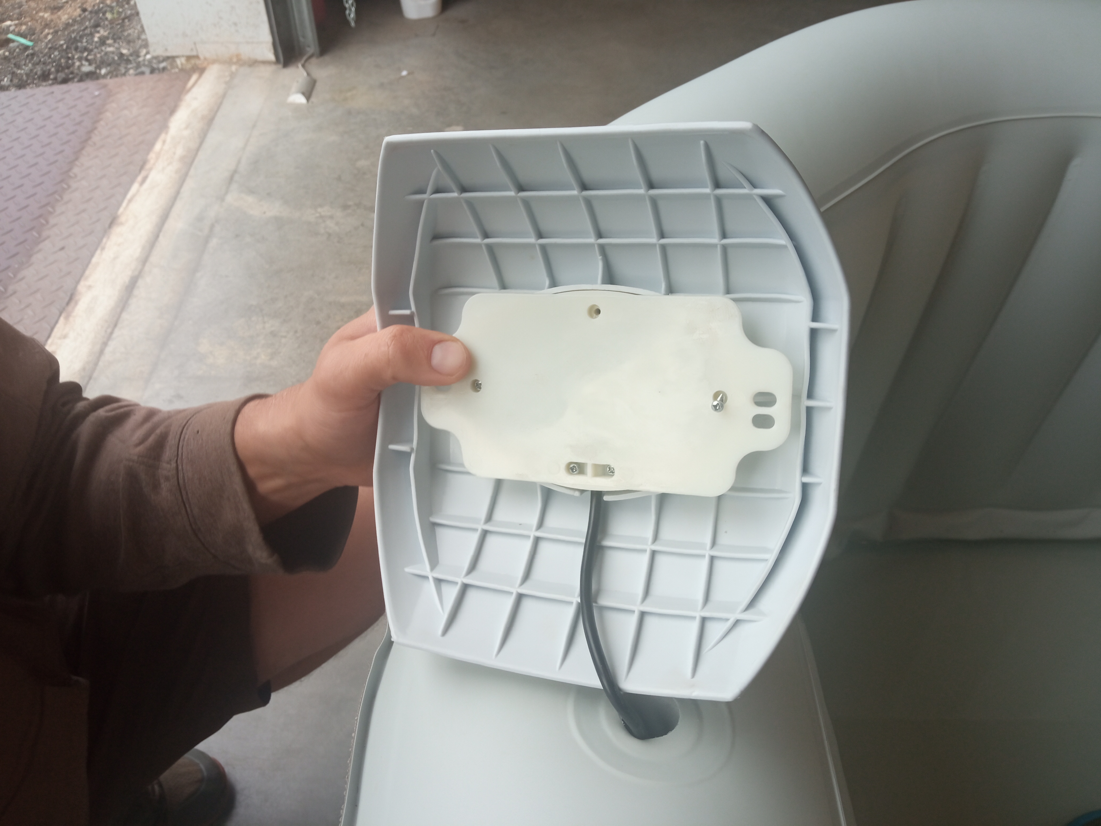 - Obróć luźny kołnierz z tworzywa PVC z włożonym panelem sterowania. Wykręć małe śrubki z białej osłony panelu i odłącz czarne złącze od spodu. Będzie ono oryginalnie uszczelnione silikonem. Przed odłączeniem należy je zdjąć.