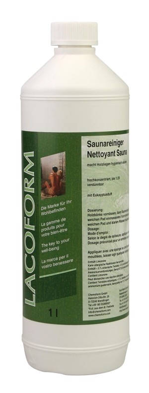 Saunę należy regularnie czyścić. Specjalny środek czyszczący, taki jak ten, idealnie nadaje się do pielęgnacji drewnianych powierzchni, takich jak poduszki siedzisk i oparć.