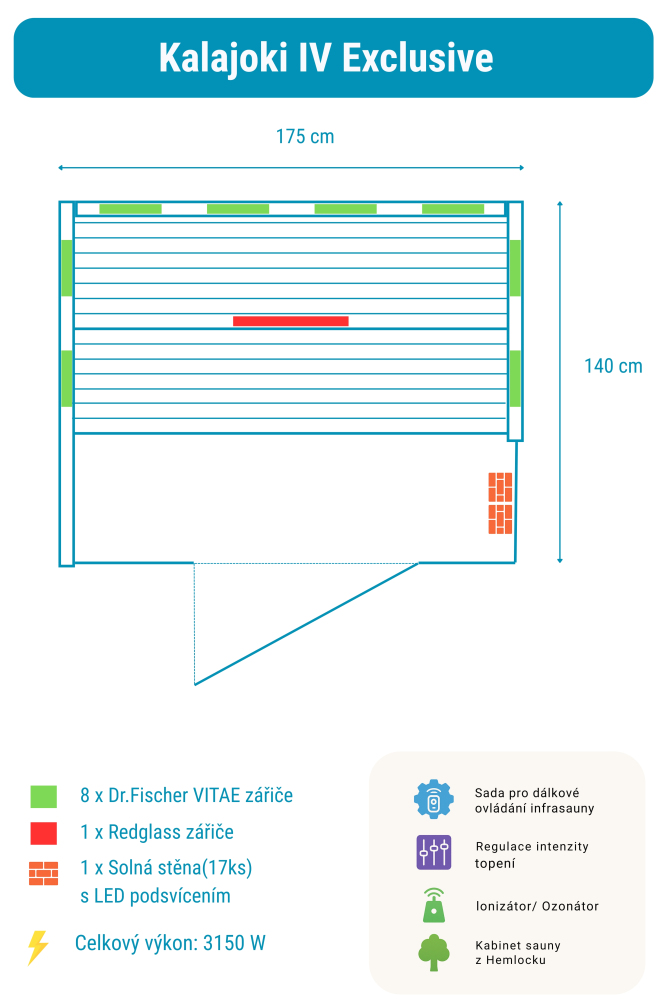 Jego integralną częścią jest podświetlenie kolorowymi taśmami LED. Podświetlenie jest zintegrowane ze światłoterapią zainstalowaną w saunie na podczerwień.