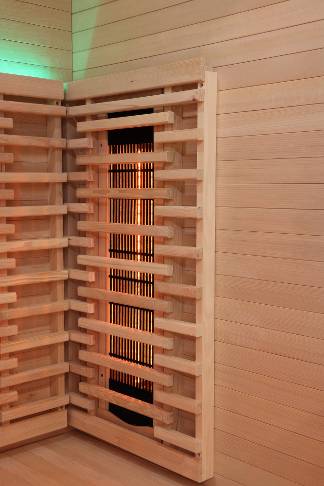 Standardowe grzejniki fabryczne: Sauna na podczerwień jest wyposażona w pełnospektralne grzejniki RedGlass Dark . W drugim kroku zamówienia istnieje możliwość wyboru grzejnika Philips Vitae w obniżonej cenie .
