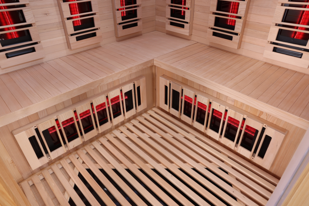 Aby zapewnić idealne i równomierne ogrzewanie całego ciała, sauny na podczerwień Belatrix wyposażone są w dodatkowy promiennik węglowy umieszczony w podłodze.