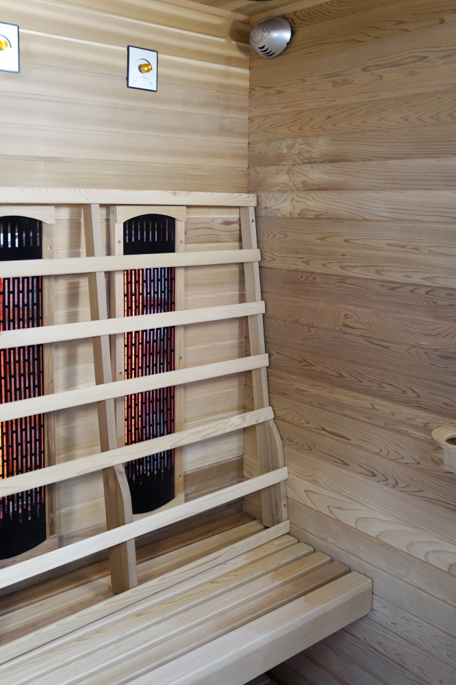 Standardní zářiče z výroby: Infrasauna je osazena plněspektrálními zářiči RedGlass Dark. V druhém kroku objednávky je možné za zvýhodněnou cenu zvolit alternativu Philips Vitae.