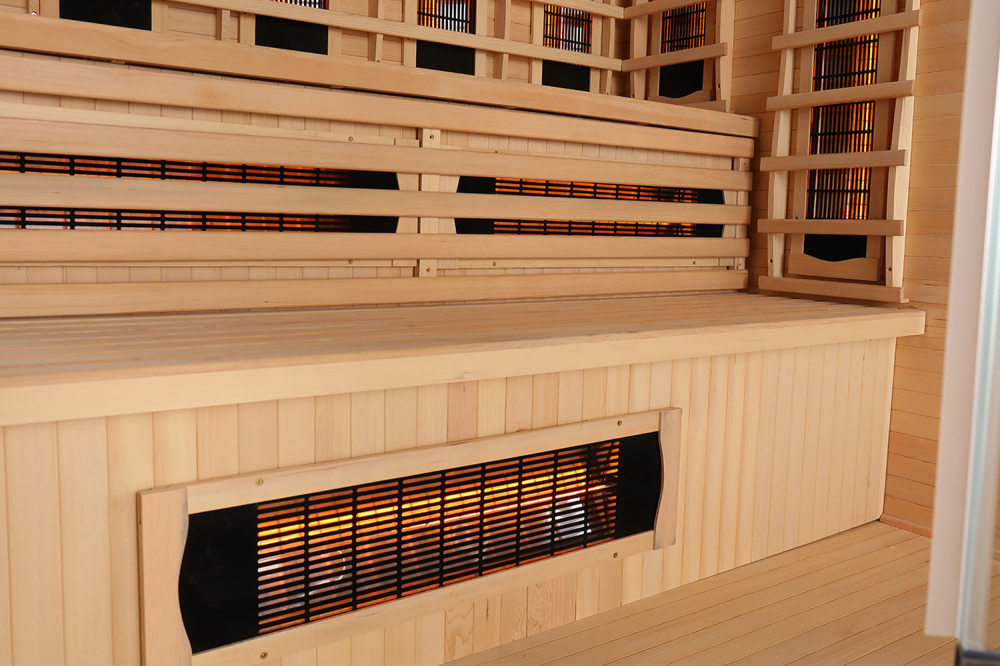Standardowe grzejniki fabryczne: Sauna na podczerwień jest wyposażona w pełnospektralne grzejniki RedGlass Dark . W drugim kroku zamówienia istnieje możliwość wyboru grzejnika Philips Vitae w obniżonej cenie .